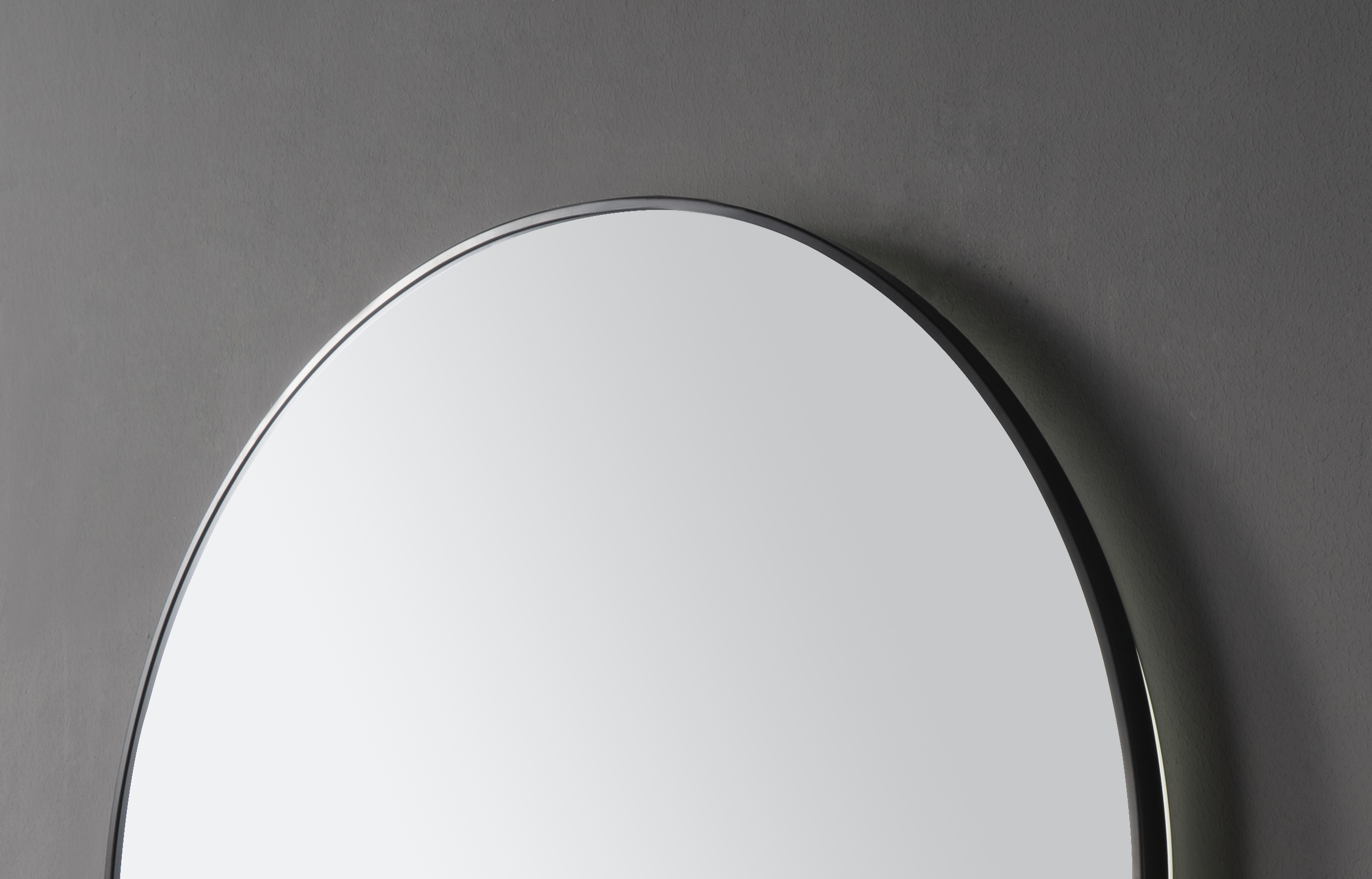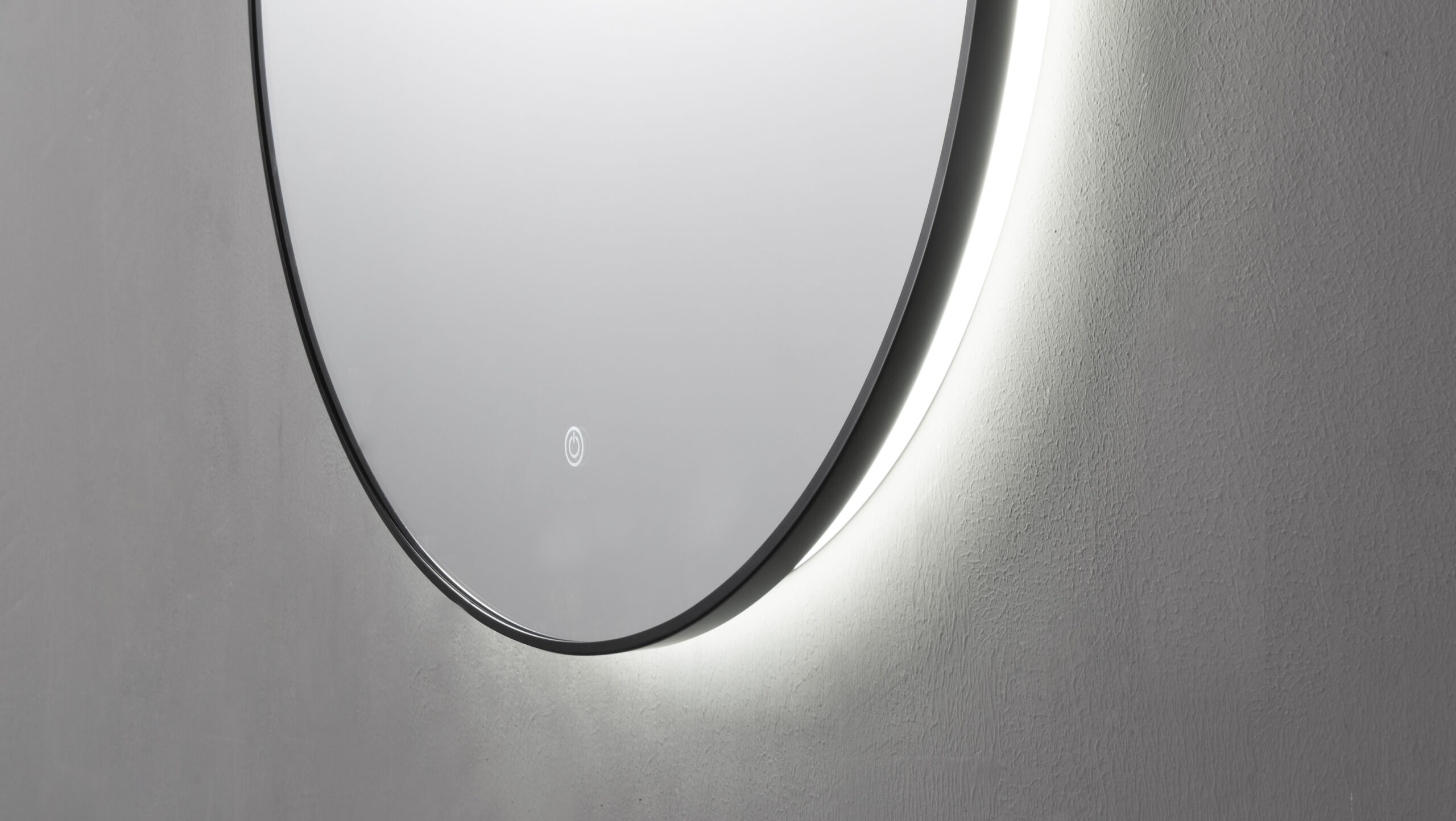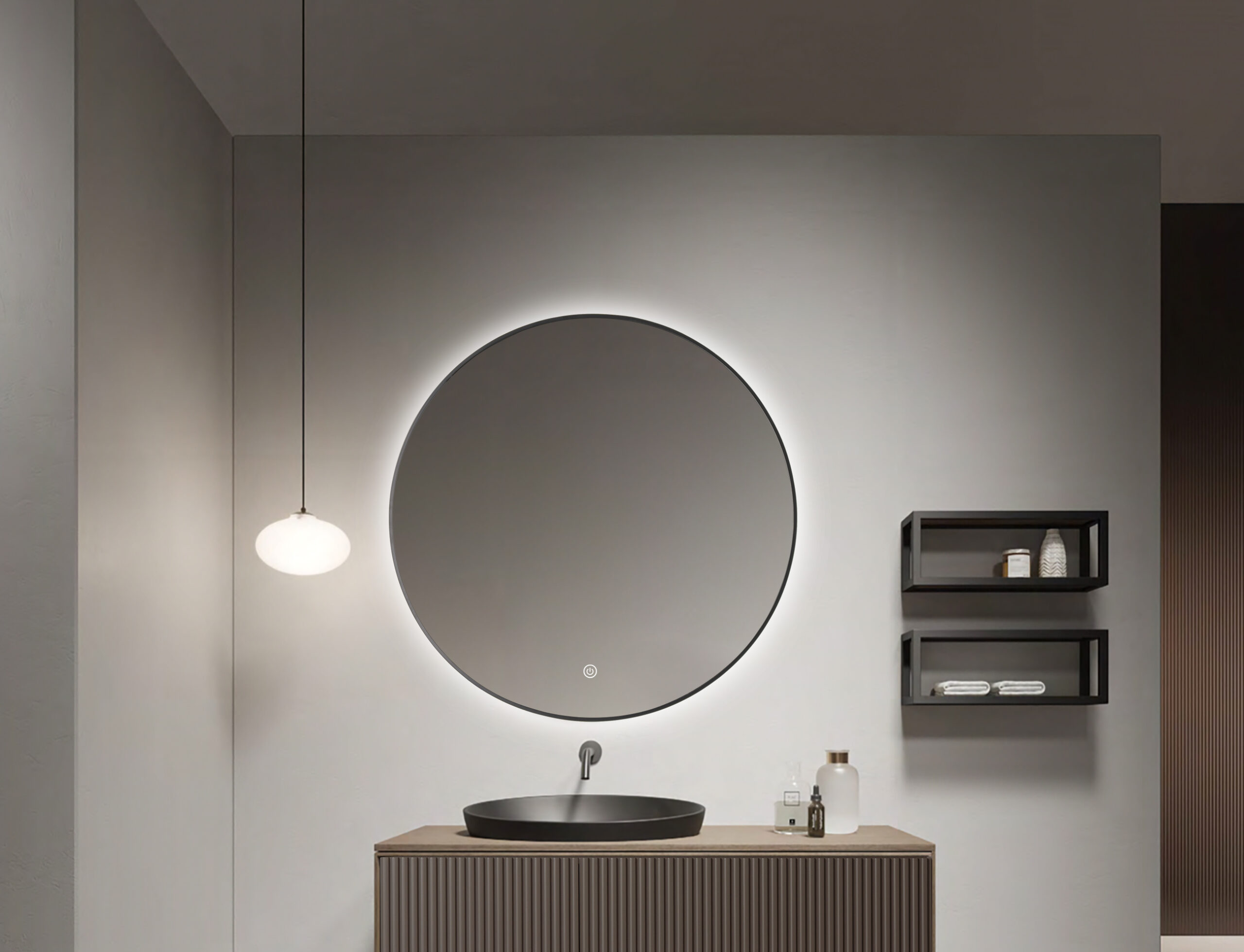 A round LED-backlit mirror with a sleek frameless design and a central touch sensor for modern functionality.