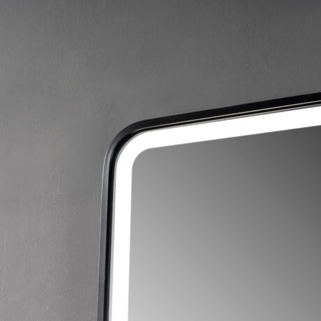A round mirror with a black frame, featuring a top-mounted LED light and touch sensor for a stylish, modern accent.