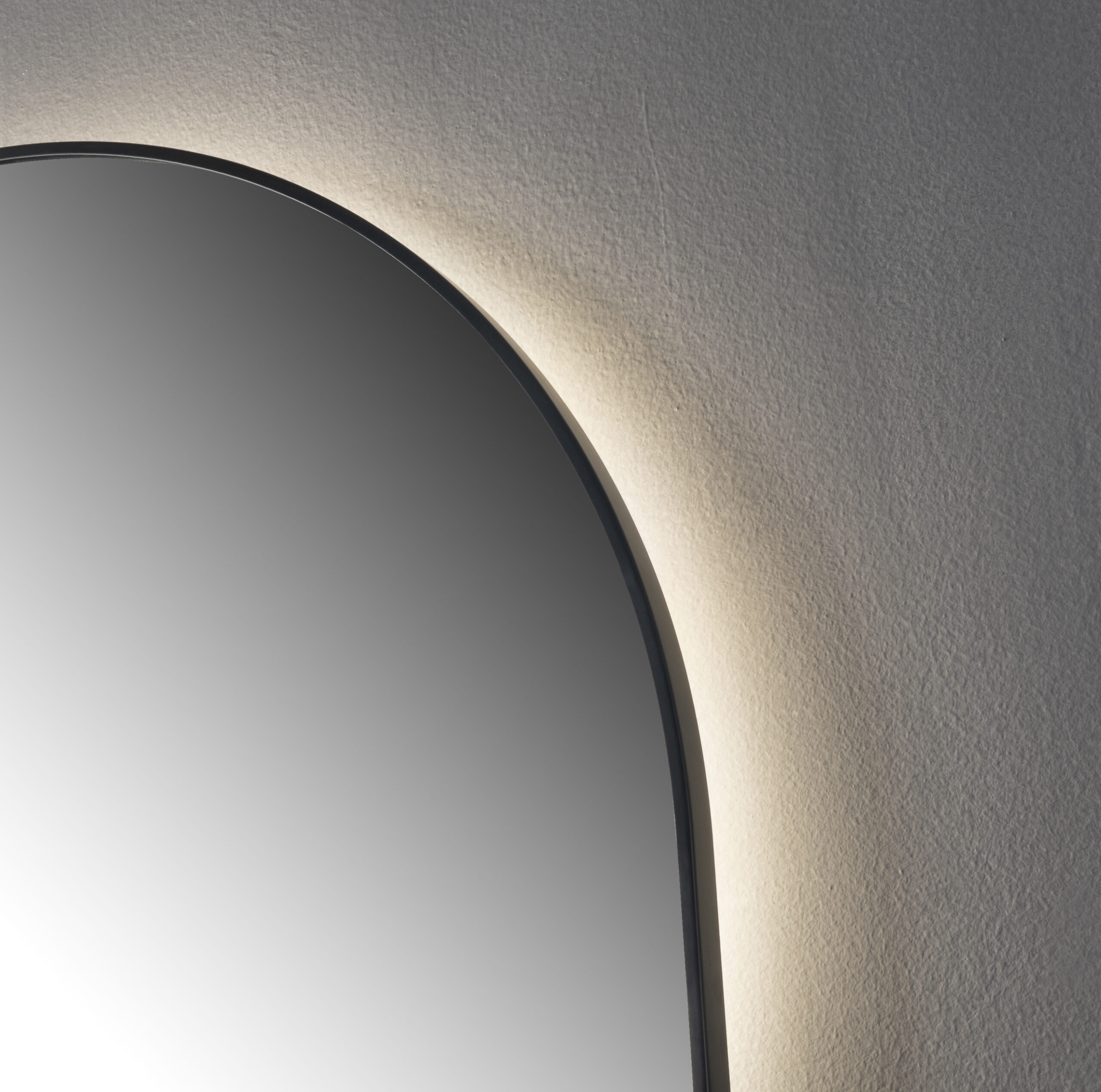 A modern circular LED-backlit mirror with a touch sensor and a sleek, minimalist design including a shelf for any necessities.